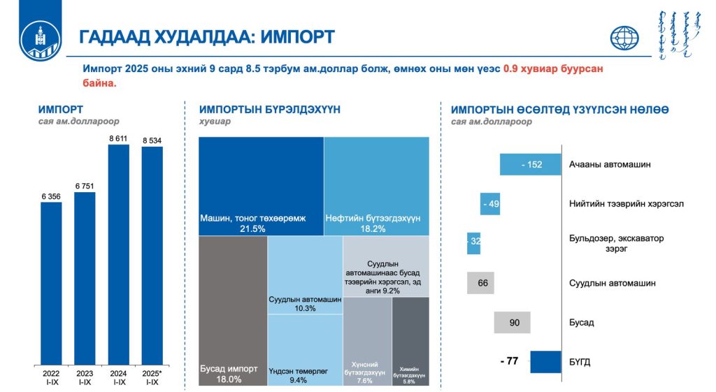 Энэ оны 9 сарын байдлаар импорт дизель 2,1, бензин 4,4 %-аар буурчээ