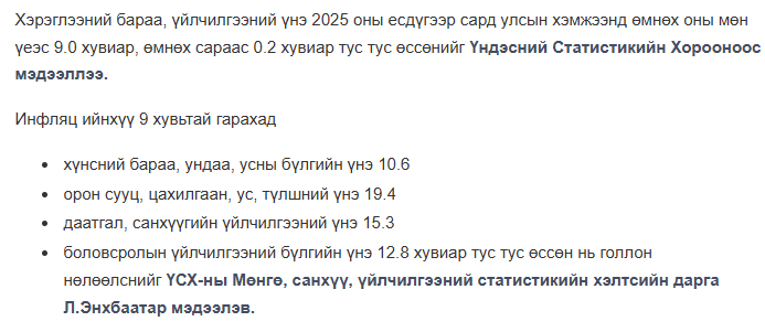 Энэ оны 9-р сард инфляц улсын хэмжээнд 9% гарчээ.